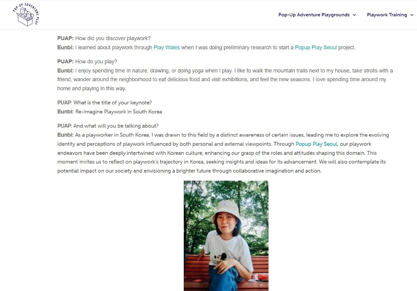 [Eng] Eunbi: As a playworker in South Korea, I was drawn to this field by a distinct awareness of certain issues, leading me to explore the evolving identity and perceptions of playwork influenced by both personal and external viewpoints. Through Popup Play Seoul, our playwork endeavors have been deeply intertwined with Korean culture, enhancing our grasp of the roles and attitudes shaping this domain. This moment invites us to reflect on playwork’s trajectory in Korea, seeking insights and ideas for its advancement. We will also contemplate its potential impact on our society and envisioning a brighter future through collaborative imagination and action.