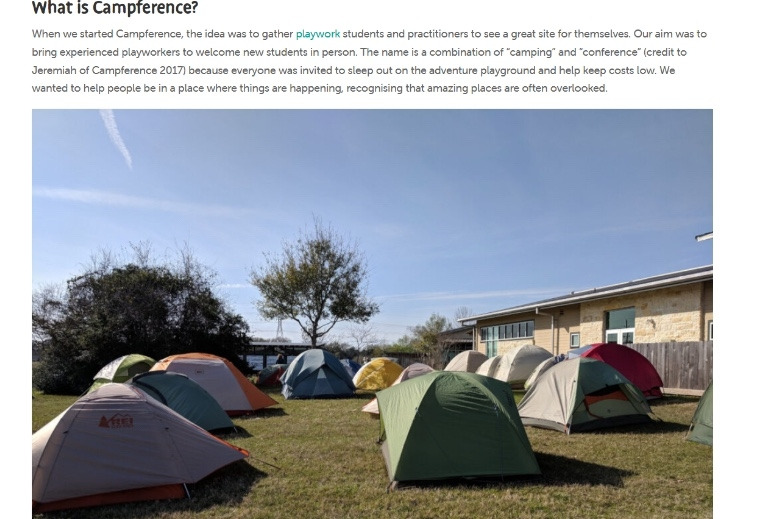 Campference는 플레이워크 연습생들과 실무자들이 직접 현장을 보고 배울 수 있는 자리를 마련하기 위해 모인 컨퍼런스 입니다. 우리의 목표는 경험이 풍부한 플레이워커들이 신입 플레이워크 연습생들을 직접 맞이할 수 있게 하는 것입니다. 이 행사의 이름은 '캠핑'과 '컨퍼런스'의 합성어로, 참가자 모두가 모험 놀이터에서 야영하며 비용을 절감할 수 있도록 기획하고 운영되었기 때문에 붙여졌습니다(Jeremiah, Campference 2017). 우리는 사람들이 활동하는 곳에서 자주 간과되는 놀라운 장소들을 인식할 수 있도록 돕고자 했습니다.