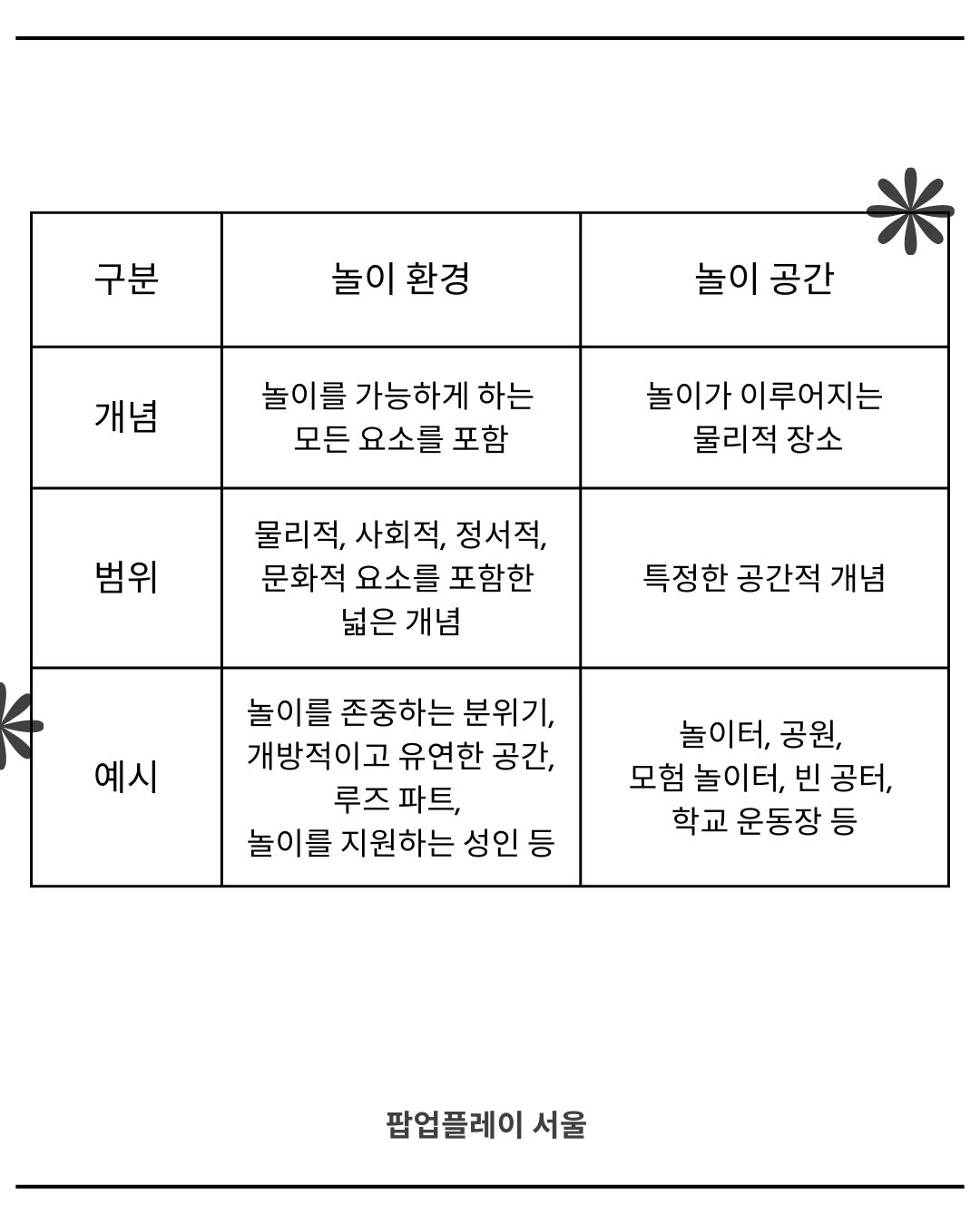 플레이워크에서 ‘놀이 환경‘과 ‘놀이 공간’은 비슷한 개념처럼 보이지만, 의미와 범위에서 차이가 있다.