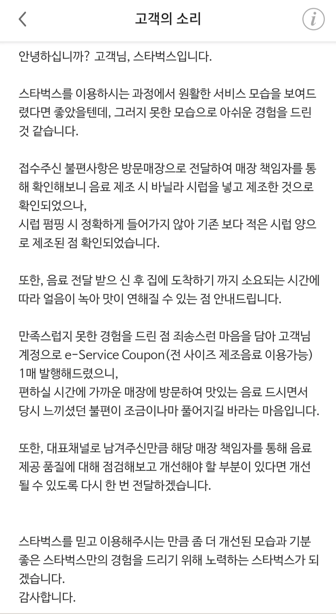 시럽 펌핑이 들어가지 않았다기엔 컵에는 너무도 정확하게 '라떼'라고 적혀 있었다. 답변 아래에는 평가란이 있었다. 늘 그랬듯이 만점을 드려버렸다. 신속하지도 더욱이 정확하지도 않았는데 말이다. 습관이 참 무섭다. 신중했어야 했는데 아쉽다.