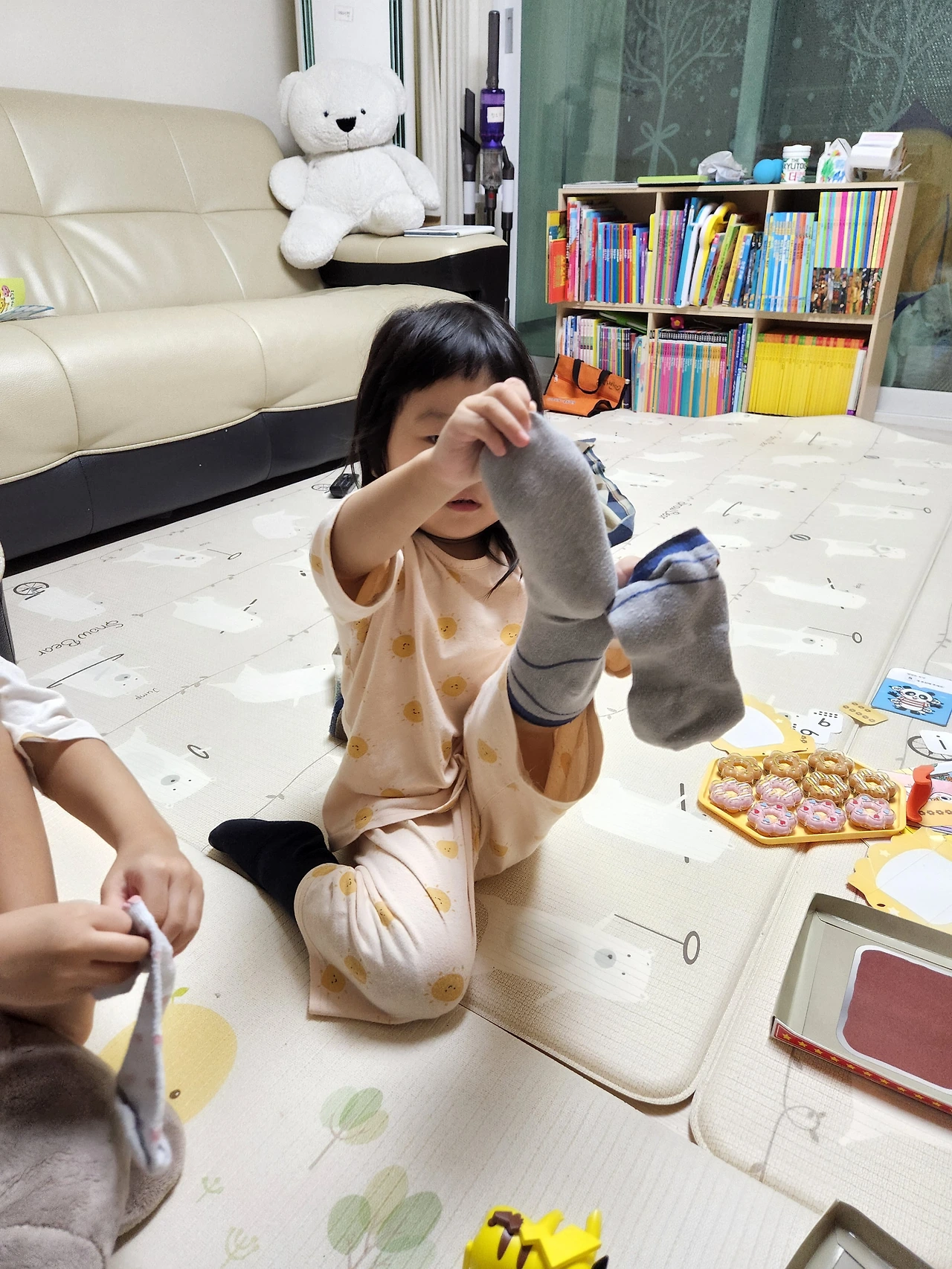 따뜻함이 살짝 가시면 아이들과 짝 찾기를 한다. 아이들이 수건은 수건끼리 모으고 양말 짝을 찾아 준다. 하나라도 먼저 찾으려는 모습이 매우 귀엽다. 가끔은 둘째 작다가 남편 팬티를 입으려 애쓴다. 질색팔색 하며 그건 안 된다고 말린다. 다행히도 오늘은 양말이다. 작다가 남편 양말을 집어 들고는 발과 다리를 올려서 신는다. 크다는 내 양말이다. 작다가 신으니 무릎 아래까지 덮였다. 한껏 신이 난 목소리로 작다가 크다에게 말했다.