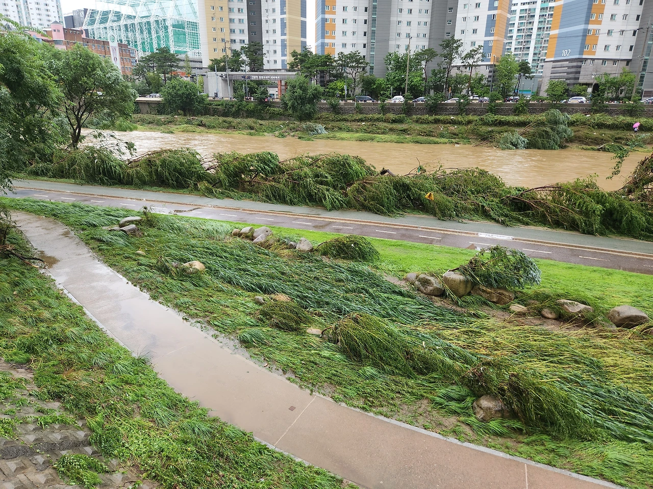 비가 많이 왔다. 침수되었단 소식이 여기저기에서 들린다. 안양천도 물이 꽤나 많이 차서 아파트 앞에 있는 안양천 산책로는 통제 대상이 되었다. 비가 안 온다며 동네 어르신들이 걱정하시는 얘기를 몇 번 들었었는데 지금은 비가 와도 너무 많이 와서 되려 더 문제다. 등원하러 나갔는데 나무가 쓰러져 있다. 빗물에 잠겼다가 모습을 드러냈기 때문인가 보다.