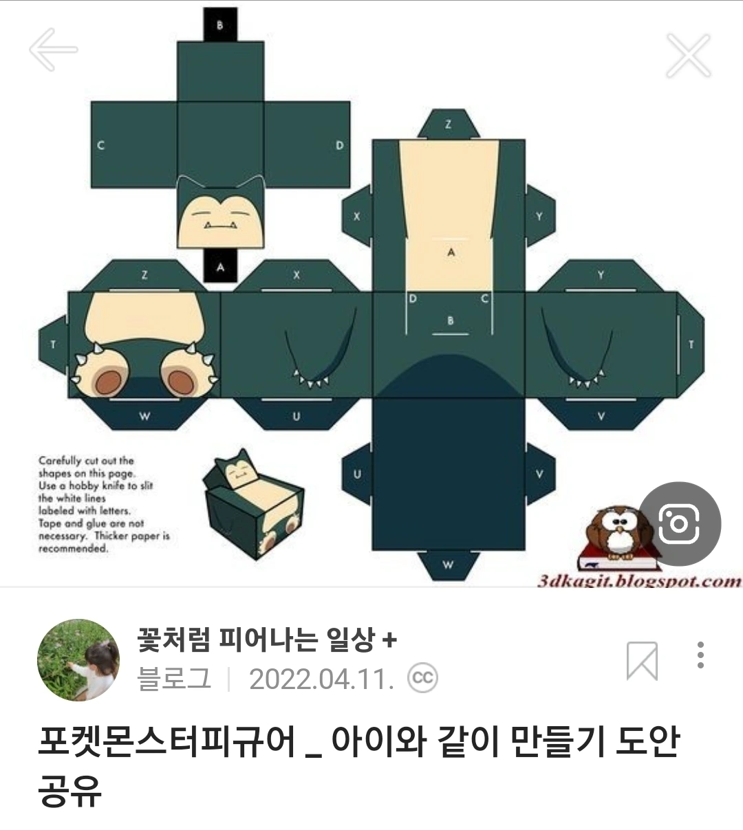 오늘은 넷플릭스로 <포켓몬스터 썬&문>을 보다가 잠만보를 출력해 달라고 했다. 잠만보를 검색해서 이미지를 작다에게 보여줬다. 하도 많이 출력해서 이제는 검색한 결과를 보여주면 원하는 그림을 선택해서 출력까지 혼자서 척척 다 한다. 7살 언니야도 아직 못하는 스킬을 6살 작다는 가지고 있는 것이다. 작다가 출력하려길래 슬쩍 봤더니 색칠도안이 아니라 피규어 만들기 도안이었다.