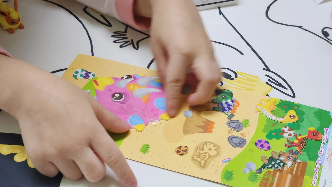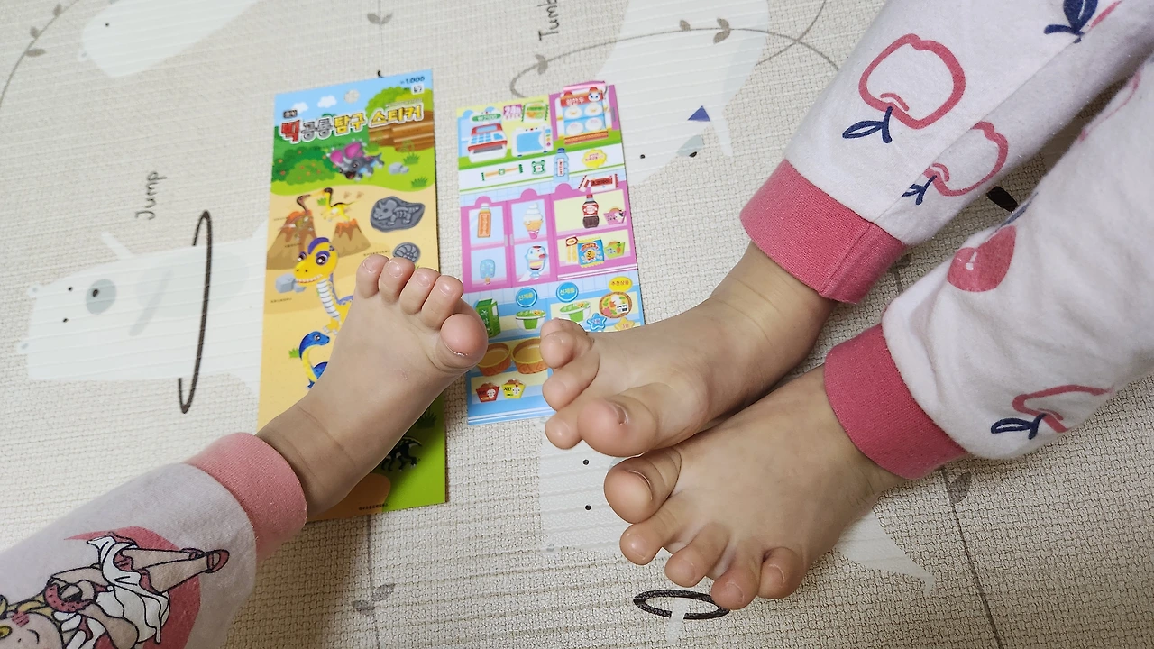 어디에 붙일까 싶어서 봤더니 스티커와 같이 붙어있는 스티커판에 하나씩 옮겨 붙인다. 이번엔 각자 놀려나 싶어 슬쩍 봤더니 같이 노는 것이 아닌가.
