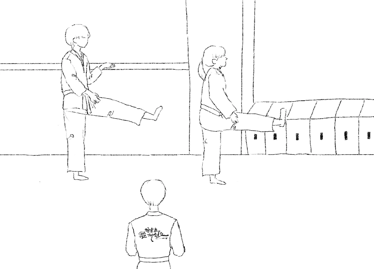다리 찢기와 스트레칭 그리고 앞차기 연습을 통해