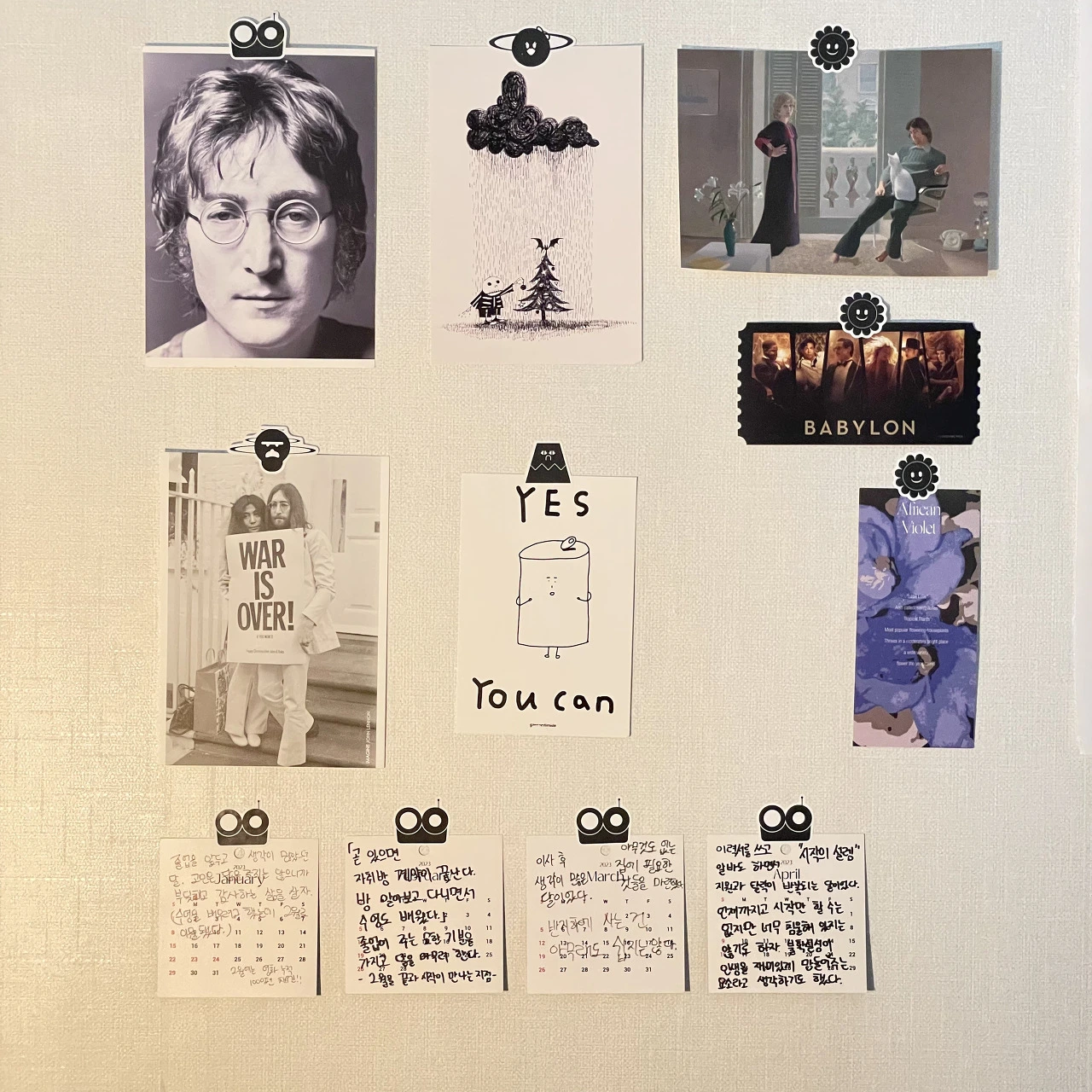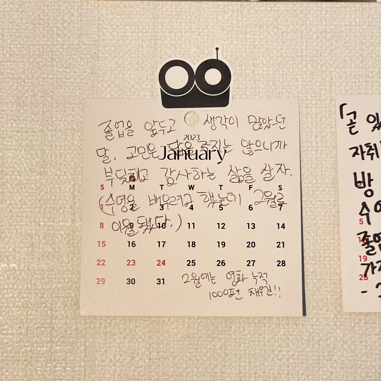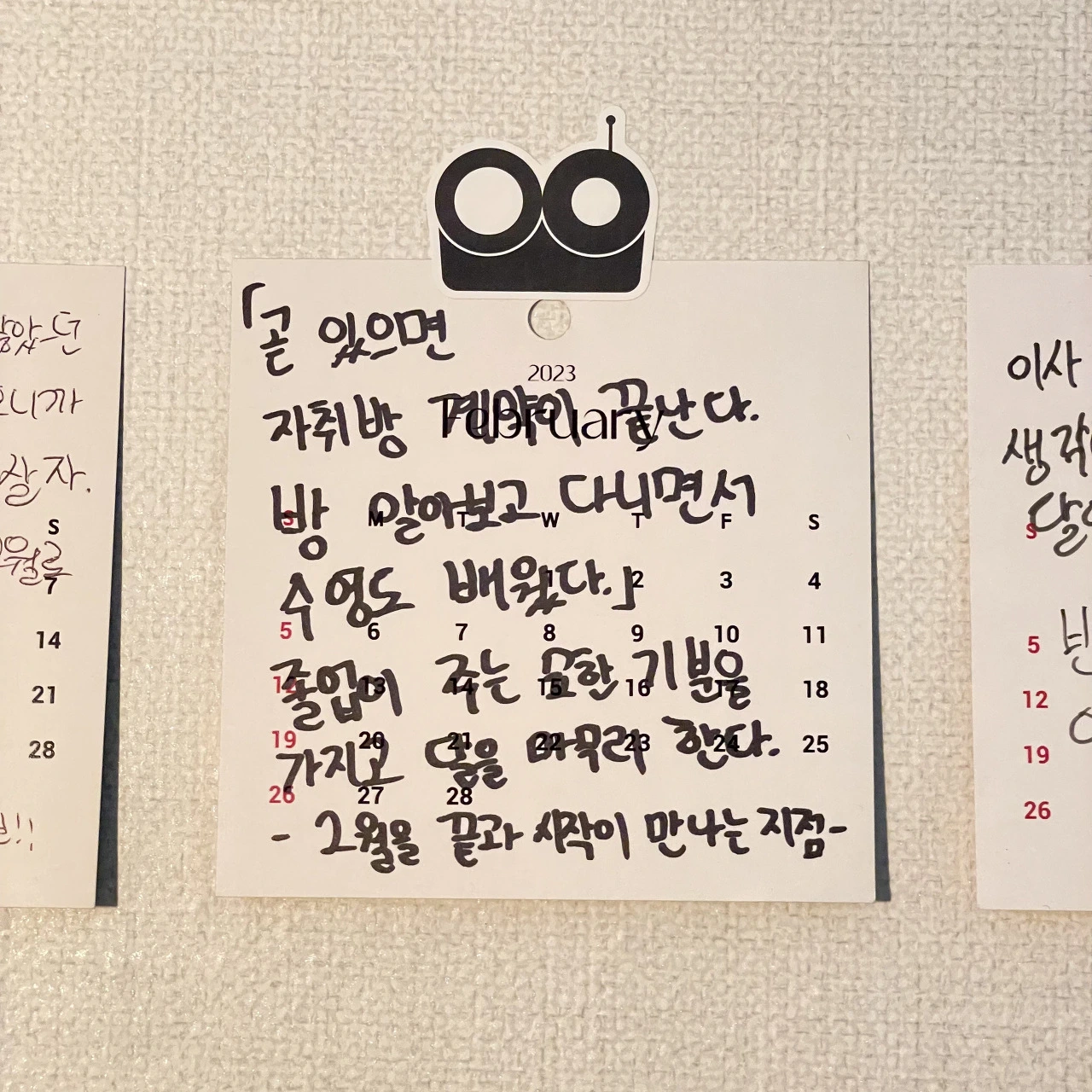 새해를 시작하면서 달력을 넘길 때마다 그 달에 대한 기록을 달력에 적기 시작했다. 가끔 일기를 쓰긴 하지만 매일 쓸 만큼 부지런한 성격이 아니라서 달력을 넘길 때마다 습관적으로 그 달에 대한 리뷰를 쓰는 게 좋을 것 같다는 생각을 했다. 졸업 전시회를 진행하면서 이름이 새겨진 달력을 선물 받았는데 넘기는 형식이 아니라 낱장을 고정시키는 형태다. 그래서 매달 리뷰를 기록하고 1년을 끈으로 묶어 보관하면 재미있겠다는 생각으로 1월을 시작했다. 뭐 대단한 이야기를 적는 건 아니고 그 달에 있었던 가장 큰 사건과 생각을 적게 되는 것 같다. 오래되진 않았지만 일단 꾸준히 써보려고 한다. 브런치에는 매달 초 저번 달을 기억하며 달력에 적은 내용과 생각들을 짧은 에세이 형식으로 올릴 것 같다. 달력에 써진 내용에 살이 붙어있는 모양새로 말이다.