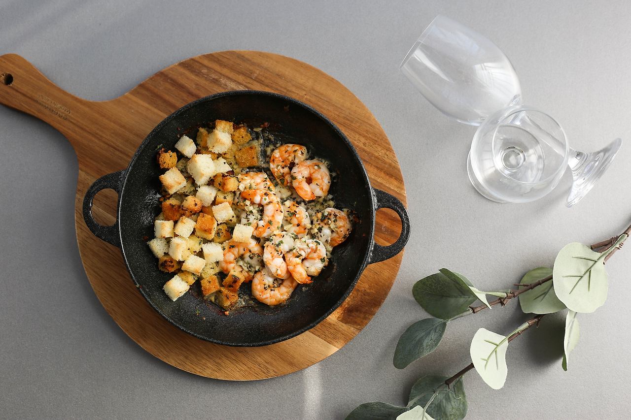오늘은 싱그럽고 향긋한 허브 버터에 버무려 오븐에서 구워낸 새우다. 따끈하게 익혔지만 새우의 풍미는 어쩐지 여름 느낌이 물씬 나게 한다. 새우만 넣으면 외로울 수 있으니 큐브 모양으로 자른 빵도 함께 구워보자. 촉촉한 새우와 바삭한 빵이 한 플레이트에서 절묘한 균형을 이룬다. 식빵, 바게트, 호밀빵 등 향이 강하지 않은 종류로 만든 요리는 와인과 함께 즐기기에 좋다.