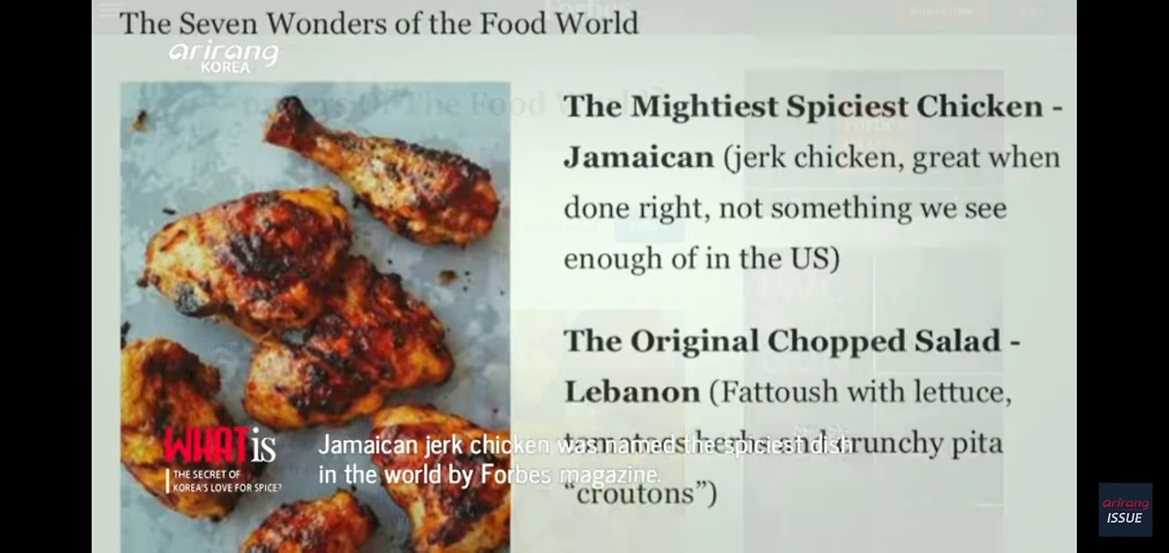 A. 얼마 전에는 포브스에서 저크치킨을 세계에서 가장 매운 요리로 선정하기도 했습니다. 저크치킨을 먹을 때에는 꼭 물을 6잔과 함께 마시라는 경고 문구도 함께 따라 붙는다고 합니다.