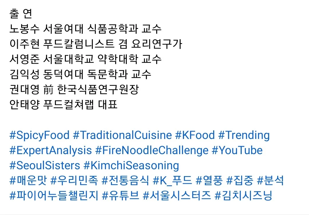 해외에서도 뜨겁게 열풍이 불고 있는 한국의 매운맛, 일명 'k-매운맛'에 대한 여러 가지 의견을 제시했습니다. 실제로 촬영은 굉장히 많은 분량을 녹화하였지만 편집본을 보니 많이 축약되었네요^^; 제가 준비했던 'k-매운맛'에 대한 인터뷰 내용 전문은 포스팅으로 올려놓을 예정입니다!