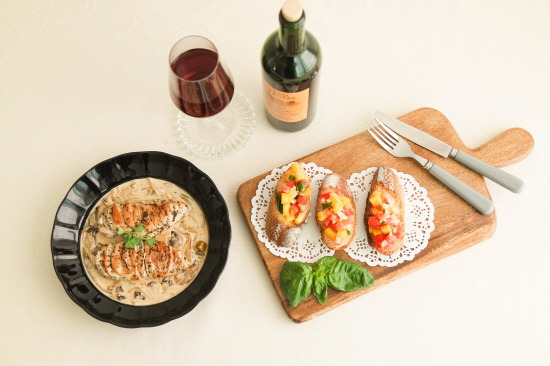 ▲ 이주현 칼럼니스트가 추천한 영화 <줄리앤 줄리아>에서 나왔던 대표적인 요리 2가지. 사진은 그가 직접 만든 양송이버섯을 듬뿍 넣은 크림소스에 로스트 치킨을 넣은 크림치킨 스튜(왼쪽)와 신선함이 가득한 토마토 바질 부루스케따. ⓒ이주현