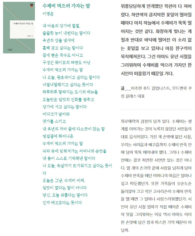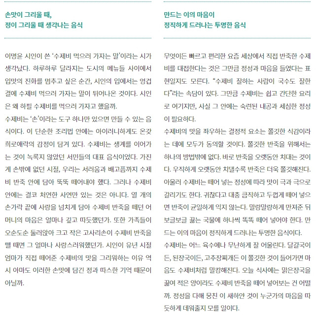 수제비는 ‘손’이라는 도구 하나만 있으면 만들 수 있는 음식이다. 이 단순한 조리법 안에는 아이러니하게도 온갖 희로애락의 감정이 담겨있다. 수제비는 생계를 이어가는 것이 녹록치 않았던 서민들의 대표 음식이었다. 가진 게 손 밖에 없던 가난한 시절, 우리는 떨어지는 목련나무의 꽃잎처럼 서러움과 배고픔까지 수제비 반죽 안에 담아 뚝뚝 떼어내야 했다. 하지만 수제비 안에는 결코 처연한 사연만 담겨 있는 것은 아니다. 열 개의 손가락 끝에 사랑을 넘치게 담아 수제비 반죽을 떼던 어머니의 마음은 얼마나 깊고 따듯했던가. 또한 가족들이 오순도순 둘러 앉아 크고 작은 고사리 손들이 수제비 반죽을 뗄 때면 그 얼마나 사랑스러운 기억으로 채워졌는지. 시인이 유년시절 엄마가 직접 떼어준 수제비의 맛을 그리워하는 이유 역시 아마도 이러한 손맛에 담긴 정 때문이 아닐까. 마음속에 쓸쓸한 눈이 내린다던 그는 각박한 현대사회를 살아가며 사람에 대한 그리움을 크게 느꼈을 것이다. 그 공허함을 수제비에 담긴 정으로 채워보려고 한 건 아닐지.