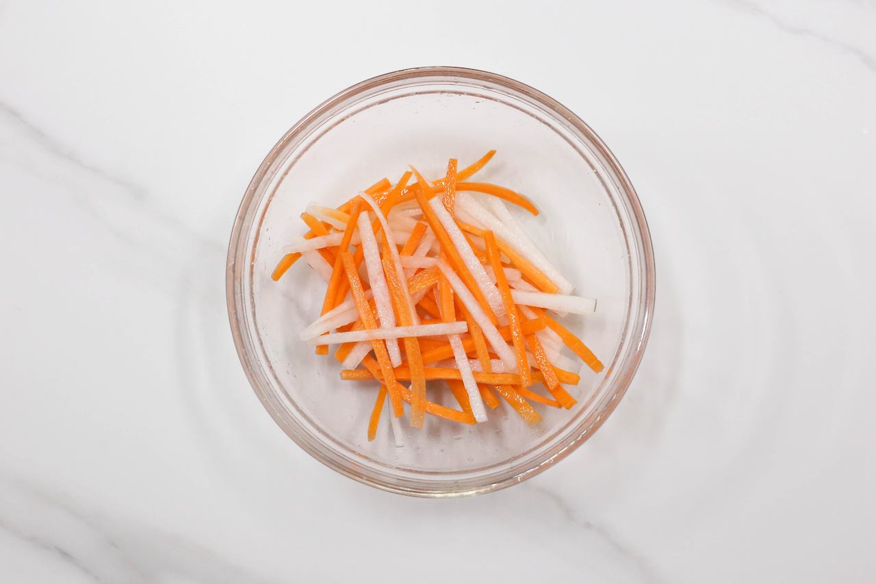 - 당근 60g, 무60g, 절임용 양념 (식초 1큰술, 설탕 1/2큰술, 소금 2꼬집)