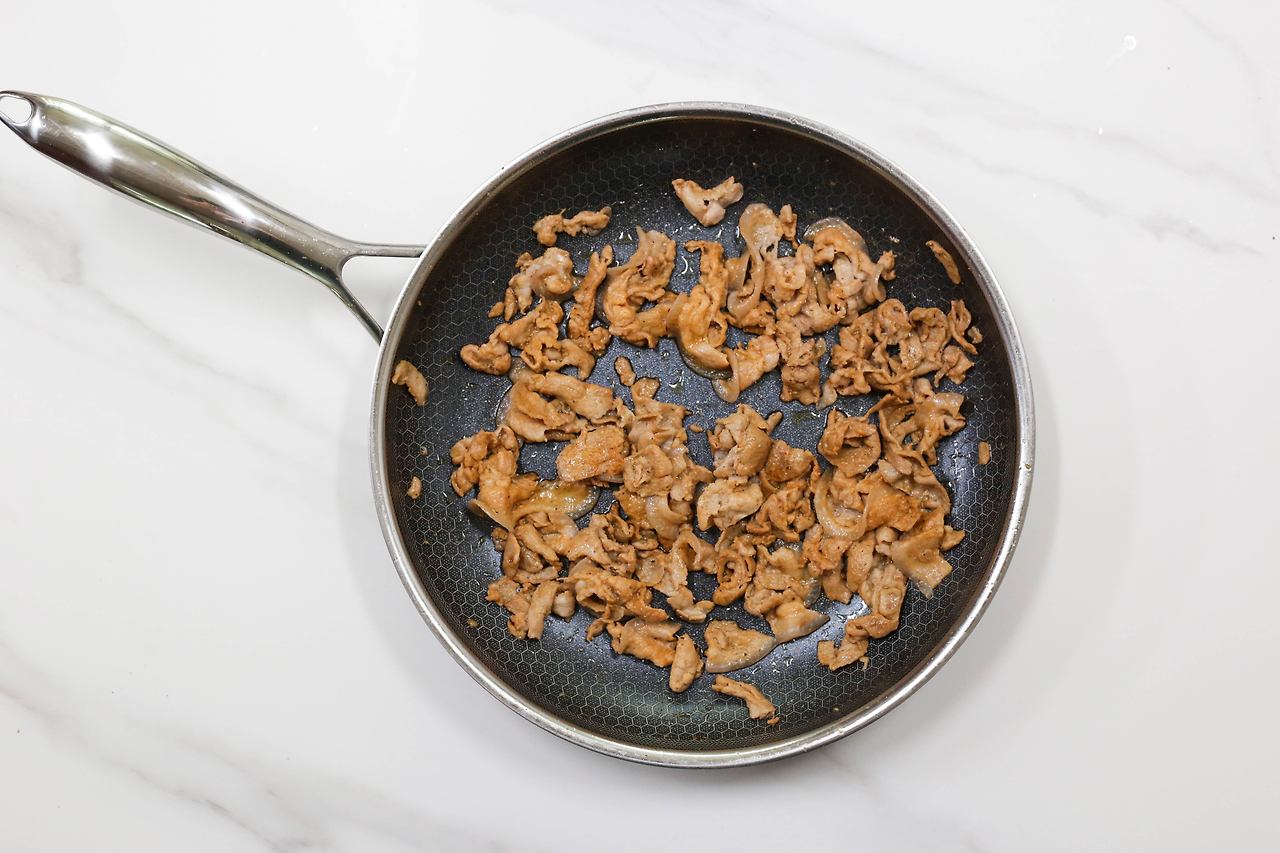 4. 기름을 두른 팬에 밑간을 한 대패 삼겹살을 넣고 볶아서 익힌다.