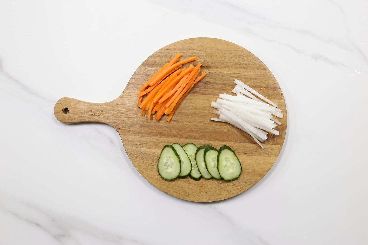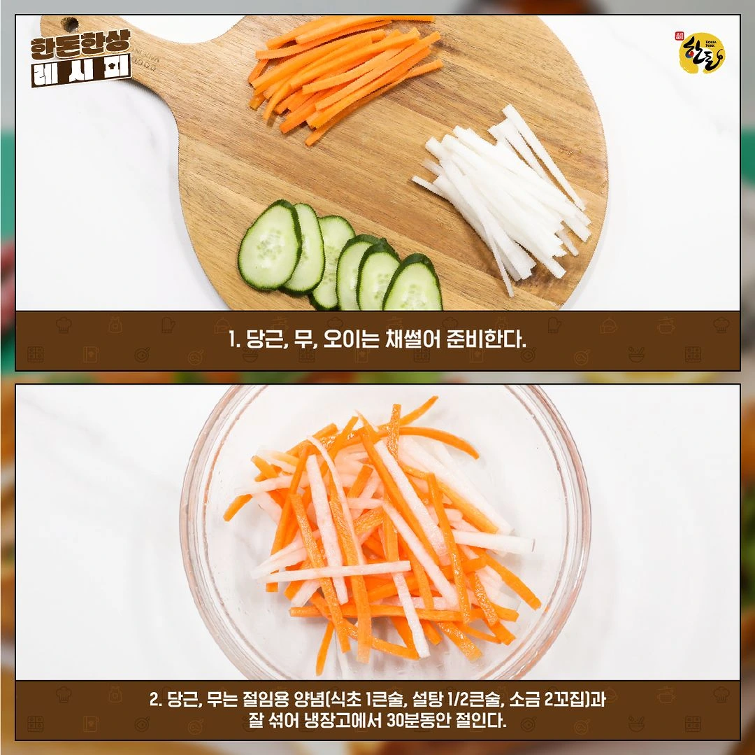 1. 당근, 무, 오이는 채썰어 준비한다.