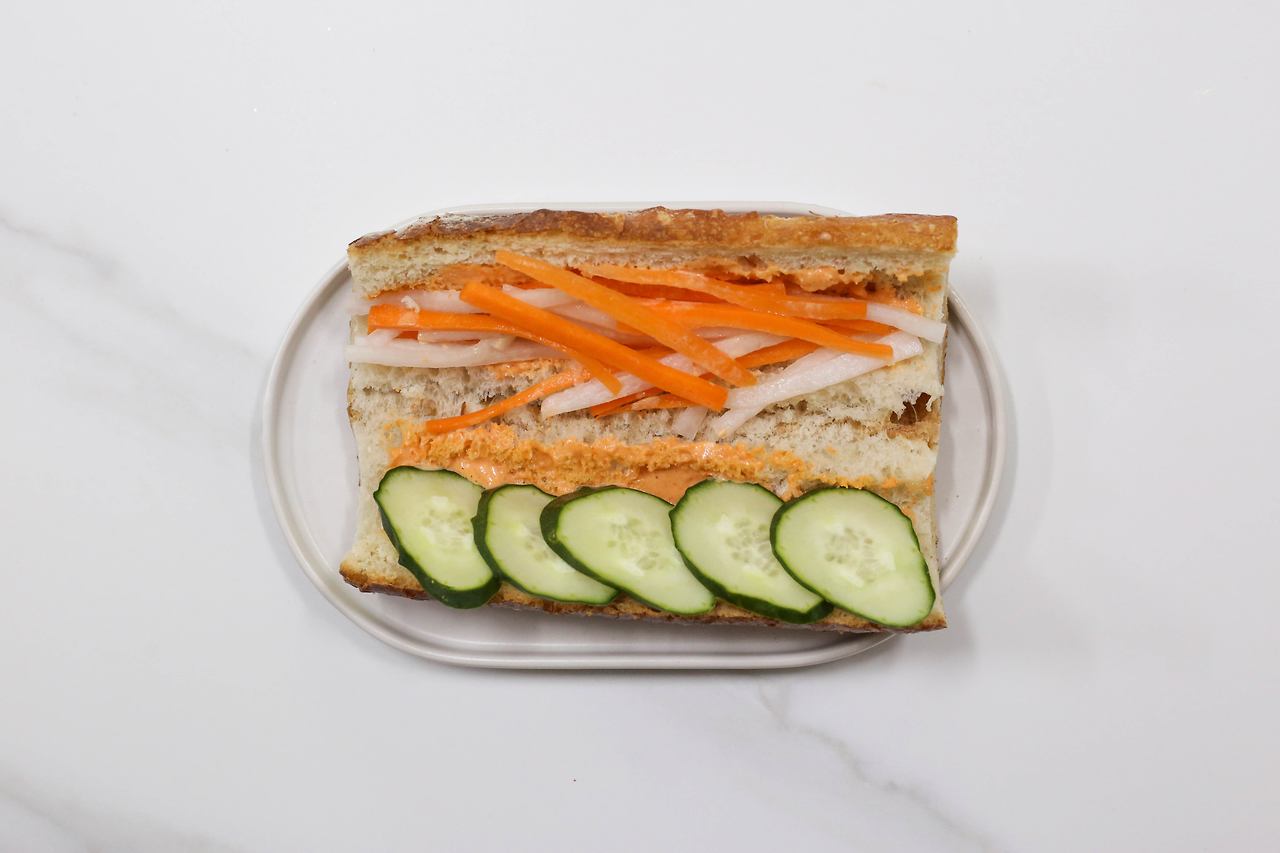 7. 스리라차 마요네즈 소스를 잘 펴바르고 한 쪽엔 오이, 한 쪽엔 무와 당근 절임을 놓는다.