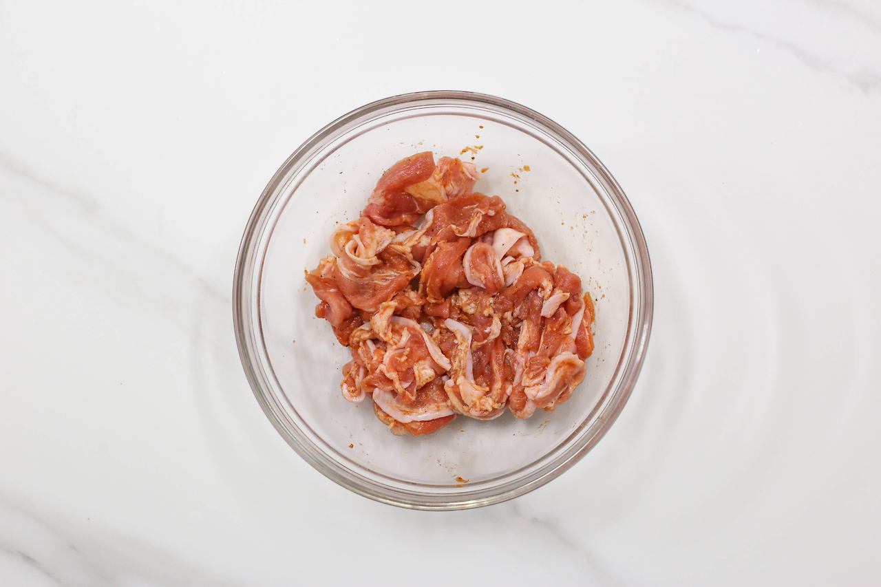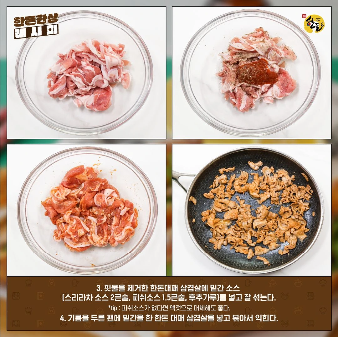 - 대패용 삼겹살 200g, 밑간 (스리라차 소스 2큰술, 피쉬소스 1.5큰술, 후추가루)