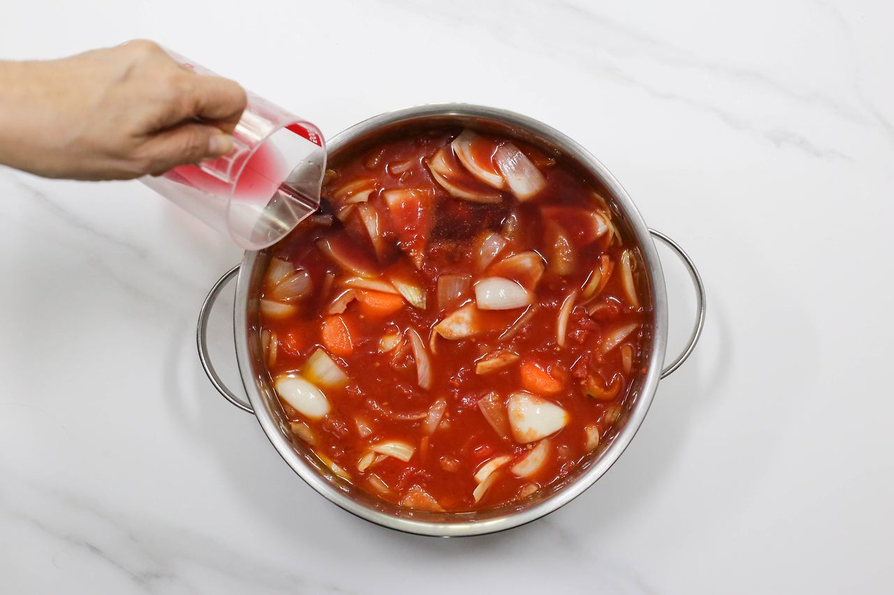 6. 볶은 채소, 홀 토마토, 치킨 육수를 넣고 끓인다.