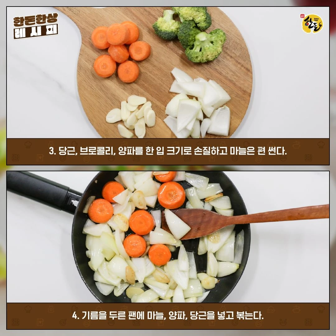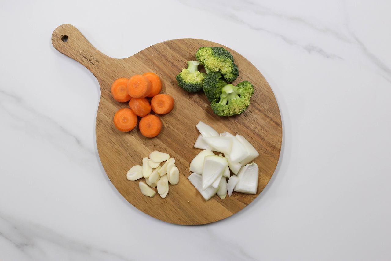4. 당근, 브로콜리, 양파는 한 입 크기로 손질한다. 마늘은 편 썬다.