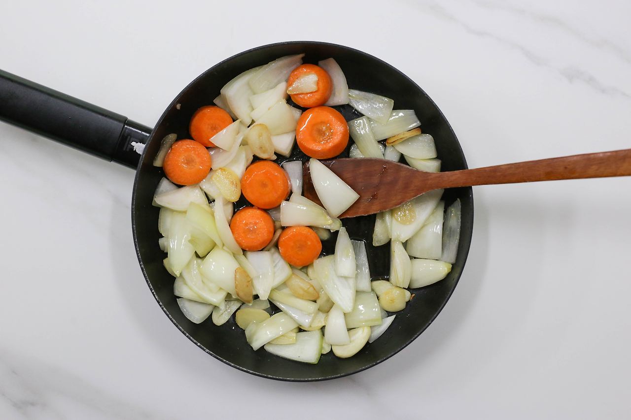 5. 기름을 두른 팬에서 마늘, 양파, 당근을 넣고 볶는다.