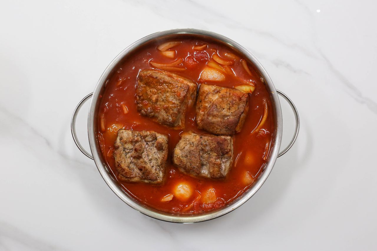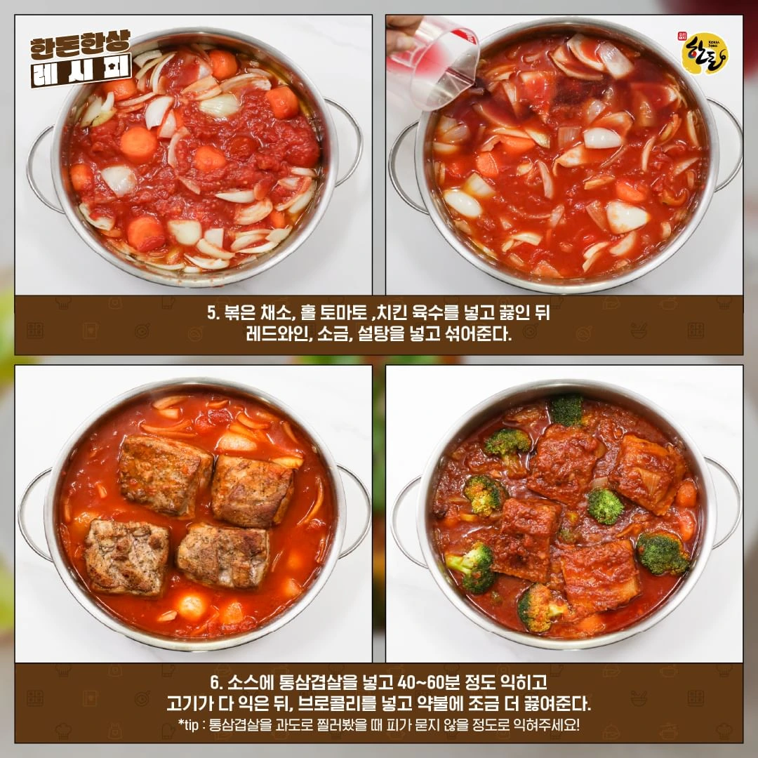 새콤달콤한 토마토 소스에 통삼겹살을 넣고