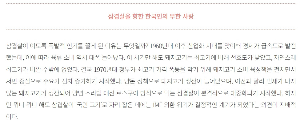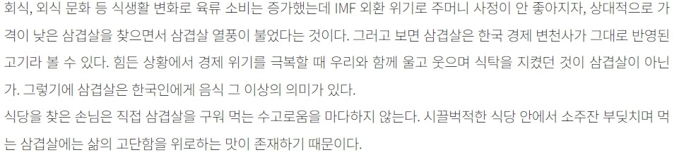 하지만 뭐니 뭐니 해도 삼겹살이 ‘국민 고기’로 자리 잡은 데에는 IMF가 결정적인 계기가 되었다는 의견이 지배적이다. 회식, 외식 문화 등의 식생활 변화로 육류 소비는 증가하였는데 IMF로 주머니 사정이 안 좋아지자, 가격이 낮은 삼겹살을 찾으면서 삼겹살 열풍이 일어났다는 것이다. 그러고 보면 삼겹살을 한국 경제 변천사를 그대로 반영한 고기라고 볼 수 있다. 힘든 상황 속에서 경제 위기를 극복할 때 우리와 함께 울고 웃으며 식탁을 지켰던 것이 삼겹살이 아닌가. 그렇기에 삼겹살은 한국인에게 음식 그 이상의 의미를 준다.