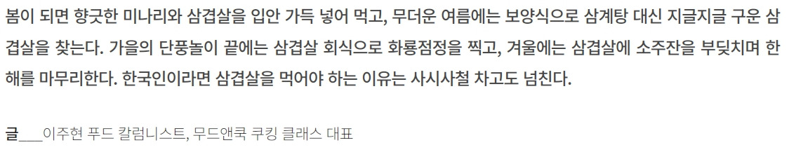 봄이 오면 향긋한 미나리와 삼겹살을 입 안 가득 넣어 먹고, 무더운 여름에는 보양식으로 삼계탕 대신 지글지글 구운 삼겹살을 찾는다. 가을의 단풍놀이 끝에는 삼겹살 회식으로 화룡점정을 찍고, 겨울에는 삼겹살에 소주잔을 부딪치며 한 해를 마무리한다. 한국인이라면 삼겹살을 먹어야 하는 이유는 사시사철 내내 차고도 넘친다. 이 정도면 삼겹살을 향한 한국인의 애정은 각별하다 못해 유난스러운 정도가 아닐까.