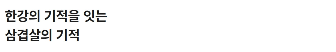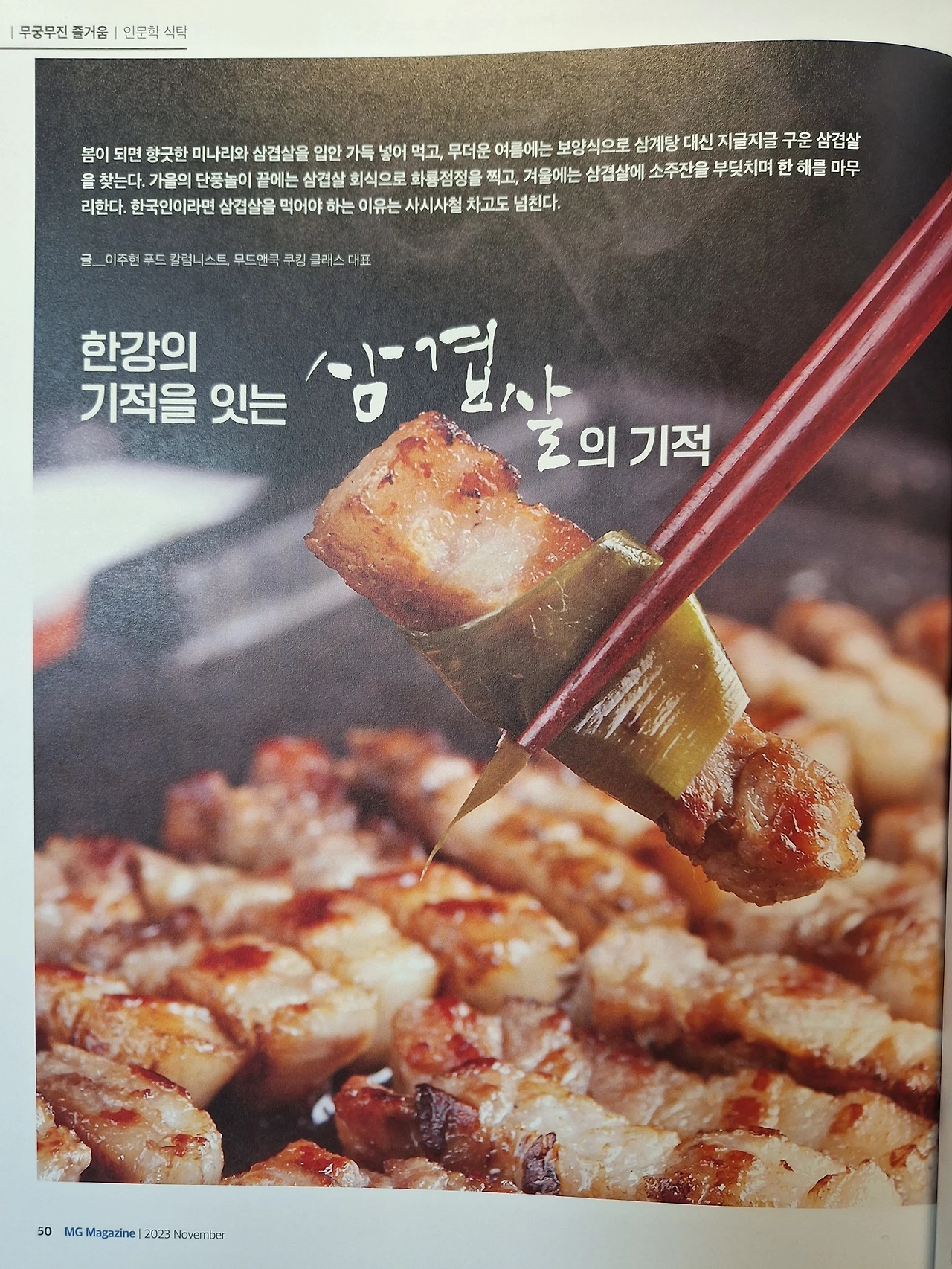 식당을 찾은 손님들은 뜨거운 불판을 앞에 두고 직접 삼겹살을 구워먹는 수고로움을 마다하지 않는다. 시끌벅적한 식당 안에서 소주 한 잔을 부딪치며 먹는 삼겹살에는 삶의 고단함을 위로하는 맛이 존재하기 때문이다. 기쁜 일은 두 배로 늘려주고, 힘든 일은 반으로 줄여주는 삼겹살은 한국인에게 변치 않는 힐링 푸드이다. ‘한강의 기적’을 잇는 ‘삼겹살의 기적’은 지금도 여전히 우리의 식탁 위에서 펼쳐지고 있다. / 푸드 칼럼니스트 이주현