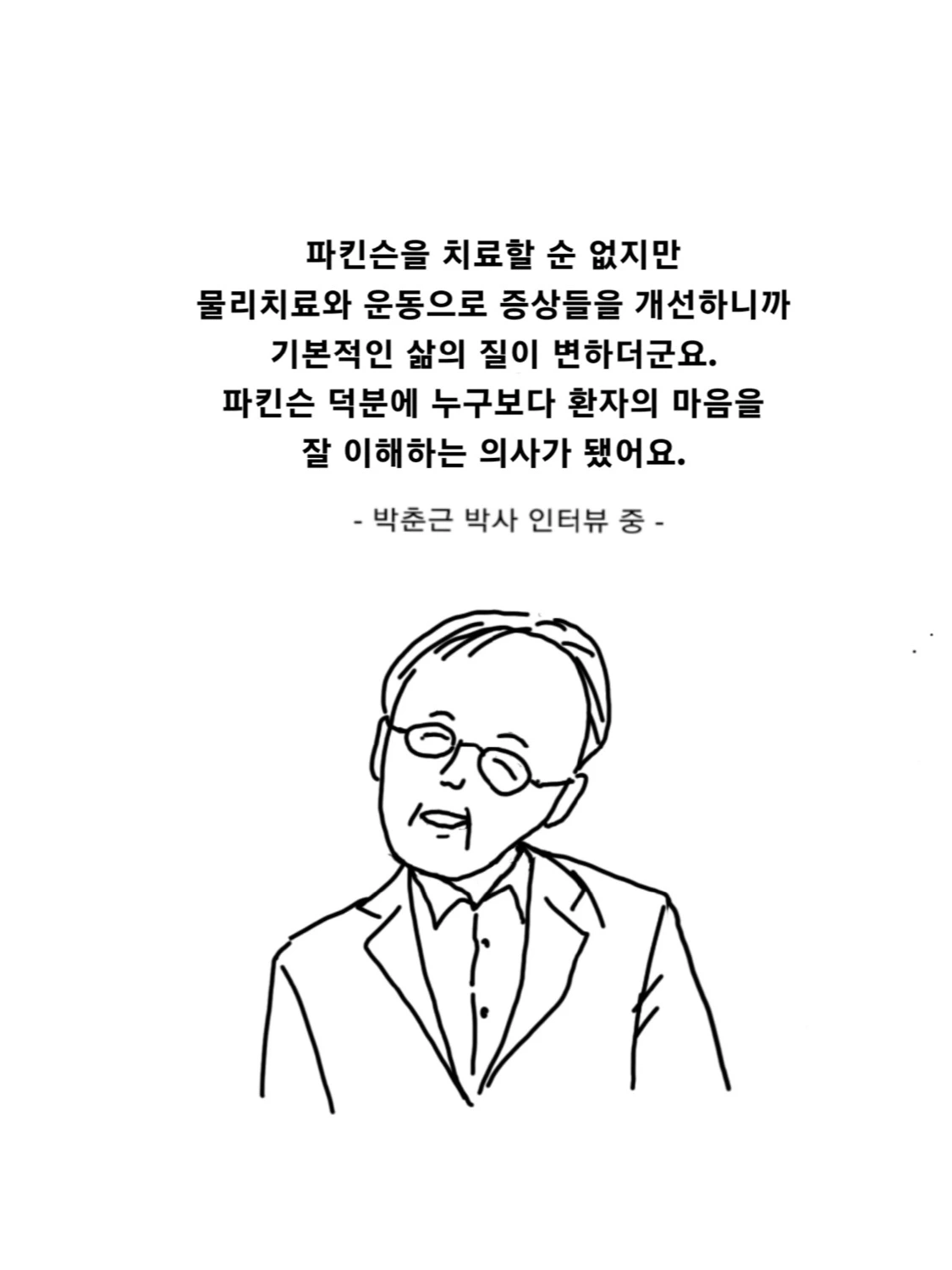 29년간 신경외과 명의였던 박춘근 박사는 현재 파킨슨 투명 중이다. 대게 파킨슨 환자는 누워만 있다고 생각할 것이다. 그에게도 목에 힘이 없어지고 음식을 삼키기 힘들어지는 등 여러 증상이 나타났다. 그러나 물리치료를 받고 운동을 하면서 하나하나 완화시켰더니 여전히 병은 진행 중이지만 삶의 질이 나아졌다고 한다. 그리고 그것을 환자들에게 알려주는 것이 그의 새로운 소망이 되었다.