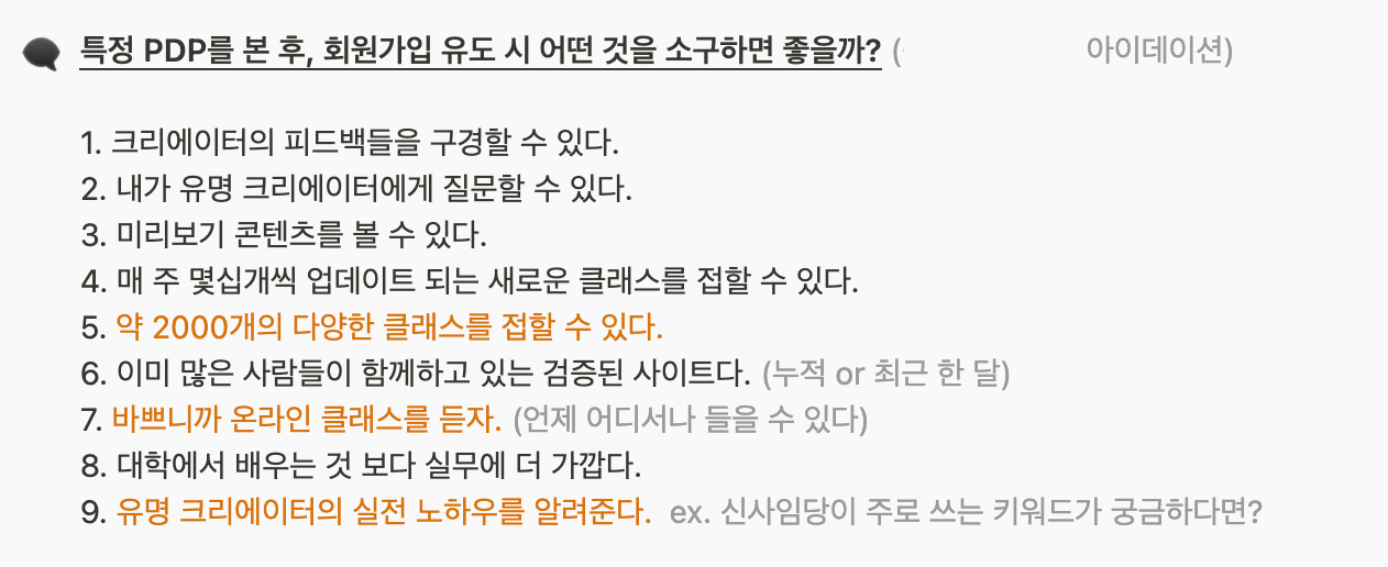 그럼 '다른 곳들은 어떻게 하고 있나?' 하는 궁금증이 생겼고, 온라인 클래스를 포함한 20곳이 넘는 서비스들의 회원가입 유도 창을 살펴보았다. 어떤 것들을 어떻게 어필하고 유도하는지 다양한 인사이트를 얻을 수 있었고, 그중 클원에 녹일 수 있을만한 요소들을 모아 5가지로 정리하고 팀원들에게 공유했다.