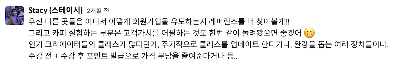 실험군 B는 비회원으로 이용하면 제한되는 좋은 기능을 (가치), 실험군 C는 완강률과 환급금을 (수치) 어필하자는 계획을 세웠다. 그러자 다른 PO는 내게 아래와 같은 말을 하고 갔다.