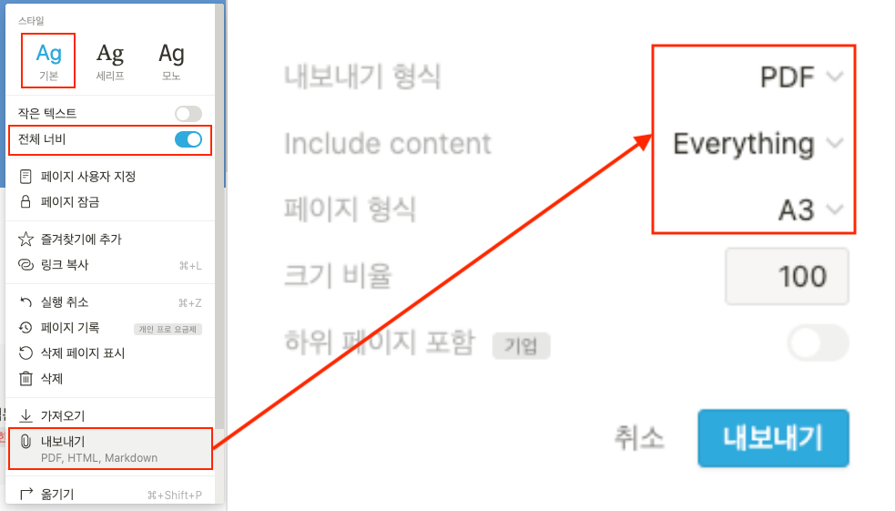 즐겨찾기 옆 … 점 3개를 누르시면 이와 같은 창이 생깁니다. 폰트 스타일(기본), 전체 너비 켜짐을 확인하신 뒤, 내보내기를 클릭합니다. 내보내기의 형식은 PDF, Include content는 Everything, 페이지 형식은 A3로 맞춰주시면 웹에서 확인하기 가장 용이한 크기로 추출됩니다!