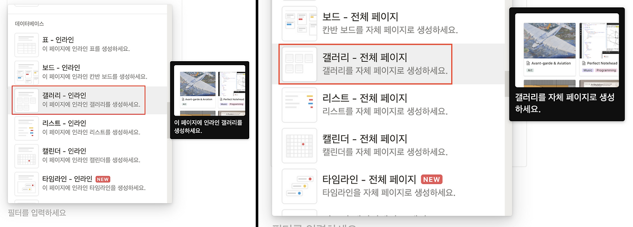 데이터베이스를 추가하실 때 유의할 점은 "인라인"으로 생성하셔야 새로운 페이지가 아닌 동일한 페이지 내에 삽입됩니다.