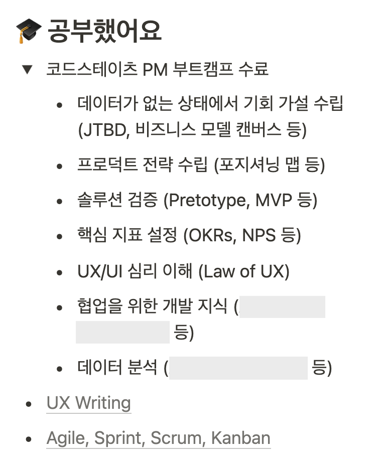 우선 [공부했어요]의 경우 코드스테이츠에서 배웠던 서비스 기획 내용들을 기재했습니다.