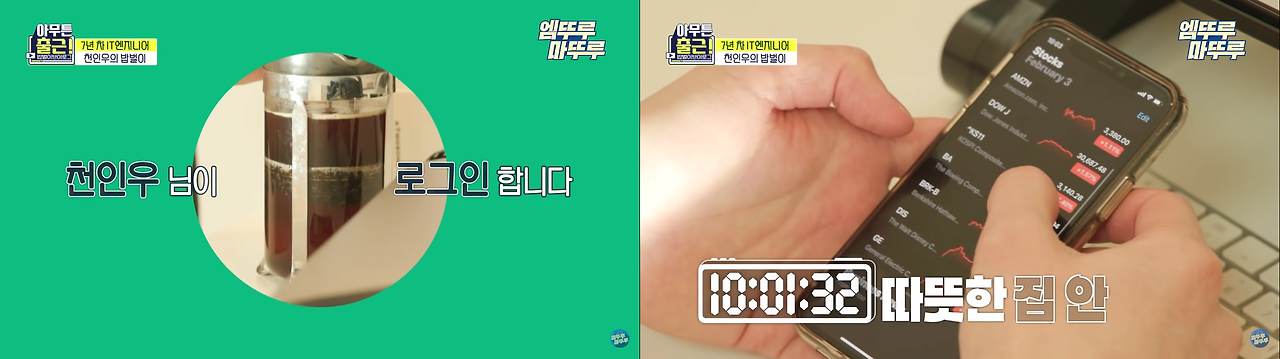 저는 뱅크샐러드에 재직 중인 공대 OPPA 천인우님의 밥벌이 브이로그 편을 재밌게 보았습니다. 오전 10시에 커피를 마시며 주식을 확인하는,, 찐 직장인 모먼트를 엿볼 수 있었는데요! 방송 당시 취준생이었던 저는 커피와 함께 주식 보듯 채용 사이트를 살피곤 했습니다. 또륵.