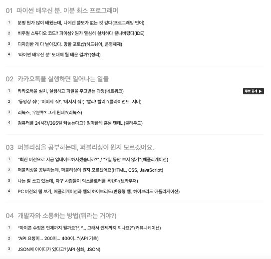 두 번째 추천 콘텐츠는 최근 카카오톡 광고를 통해 접한 <직장인 필수 코딩 용어 해설>로 무료 클래스다.