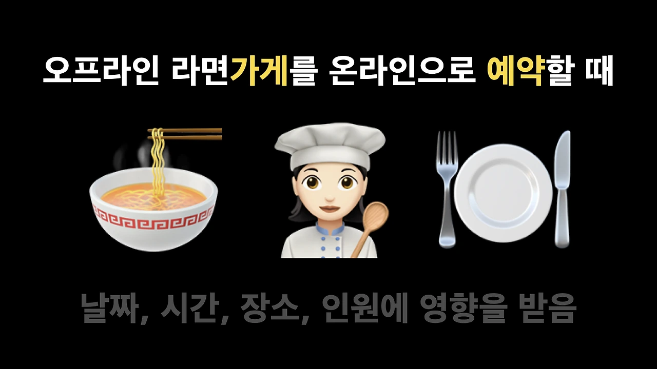게다가 레스토랑이라는 하나의 공간에 착석할 수 있는 자리의 수는 제한적이다. 그래서 테이블의 회전율이 중요하다. 무한대에서 하나씩 sold-out 되는 방식으로 재고관리를 하던 온라인 플랫폼과는 달리, 앞선 고객(= 대실)이 라면을 다 먹고 그 자리를 비워줘야, 그다음 고객(= 숙박)을 받을 수 있다. 한마디로 소장 대신 대여의 개념이며, 탐색에 있어 날짜와 시간의 영향을 크게 받는다.