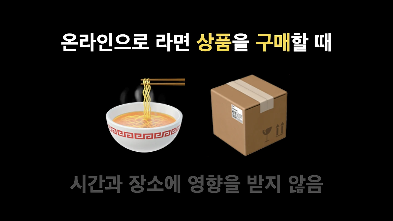 고객 입장에서는 24시간 언제 어디서든 구매가 가능하며, 원하면 내가 직접 이동할 필요 없이 집까지 직접 배송도 받아볼 수 있다. 결제하여 내 것이 되면 소장의 개념이기 때문에 지금 당장 끓여먹어도 되고, 냉장고(= 내 정보)에 넣어놓고 나중에 내 시간이 편할 때 꺼내 먹어도 된다. 수강 기한, 즉 상품의 유통기한만 지키면 된다.