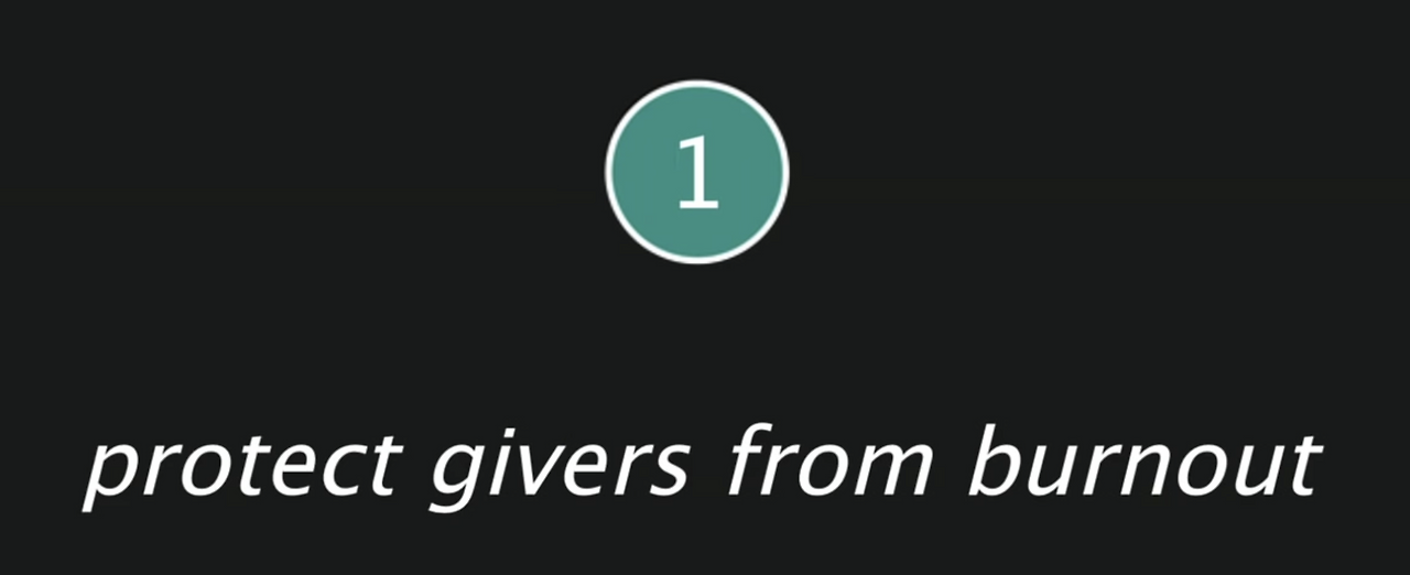 그는 세 가지 방법을 제시했고, 무엇보다 첫 번째는 Giver들이 지치지 않도록 지켜주는 것, 바로 가벼운 선의를 베푸는 것이다. 누군가에게 지식을 공유하거나 피드백을 주는 등 직접적으로 도와주는 것도 좋지만, Giver들을 서로 소개해 주는 것도 좋은 방법이다. 영상에서는 하루에 5분 정도 직간접적으로 선의를 베푸는 '5분 선의'를 지향한다.