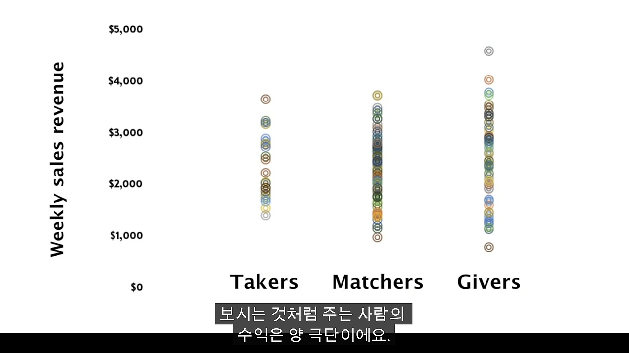 하지만 외대생들의 성적, 영업 사원들의 수익, 엔지니어들의 생산성 등 성과 중심으로 트래킹 해보았을 때, 가장 성과가 높은 집단도 낮은 집단도 Giver 들이었다. Giver들이 남들을 돕고 선의를 베풀면서 조직 및 기업의 이윤, 고객만족도, 고용 유지율도 더 높아지는 현상도 발견된 것이다.