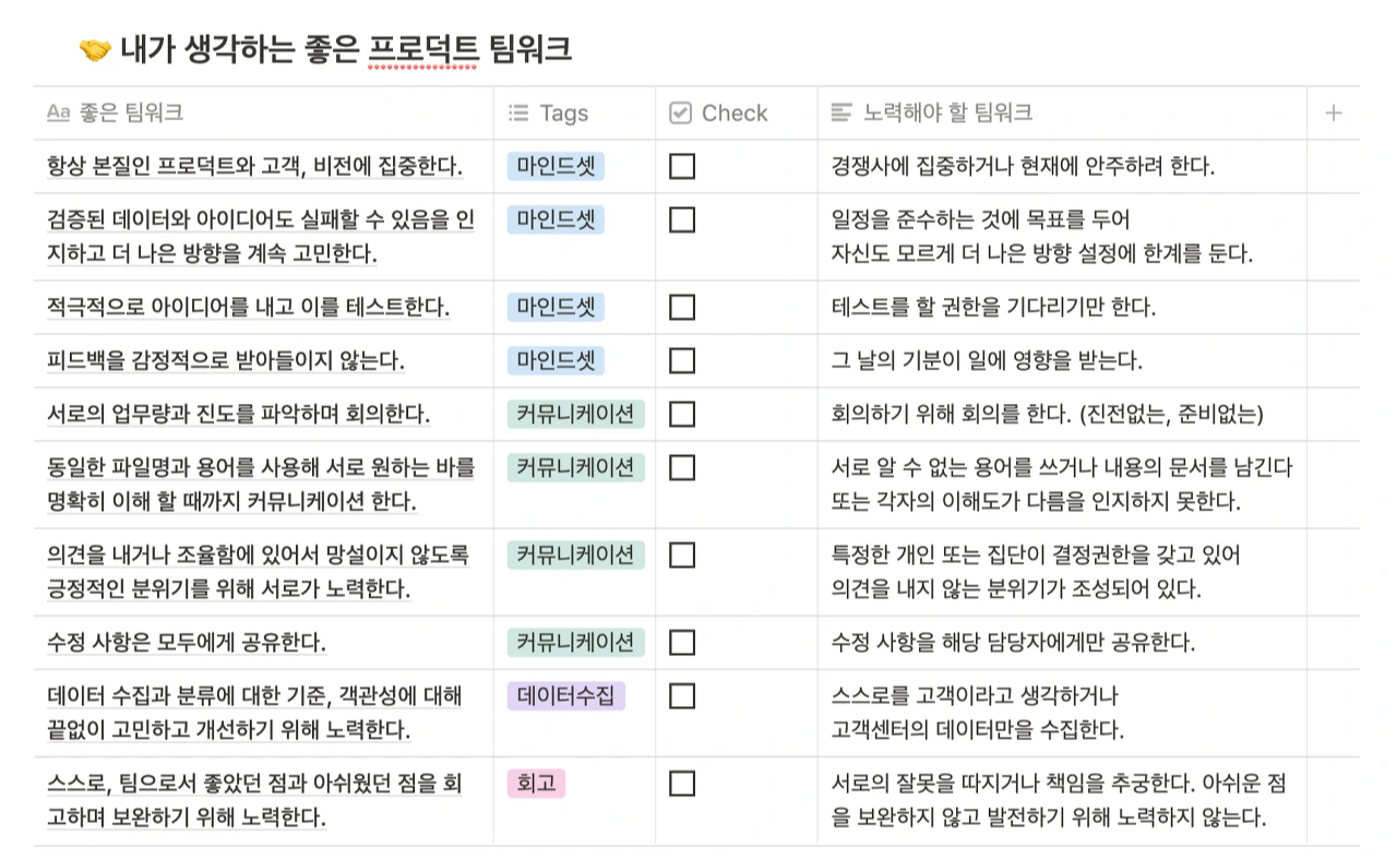 이러한 나의 생각들을 바탕으로 미래의 내가 프로덕트 팀에 합류하게 되었을 때 조금이라도 더 올바른 PM의 역할을 하길 바라며 회고를 추가해 [내가 생각하는 좋은 프로덕트 팀워크 체크리스트]를 만들어 보았다. (열심히 고뇌한 지금의 나를 잊지 말길...)
