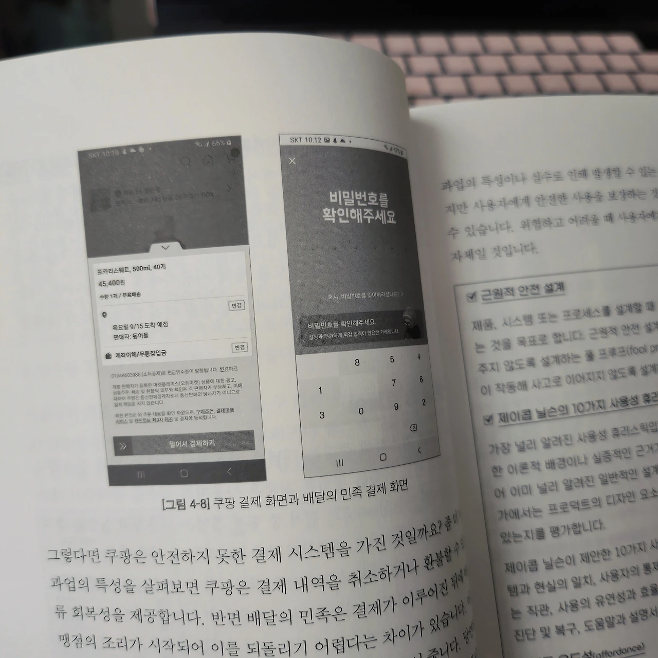 책에 재밌는 예시가 있는데요, 결제 완료 화면에서 '쿠팡'은 밀어서 결제하기를 제공하는 반면 '배달의민족'은 비밀번호를 꼼꼼하게 입력하게 하는 UX를 제공합니다. 그렇다면 쿠팡은 안전하지 못한 결제 시스템을 가진 것일까요?