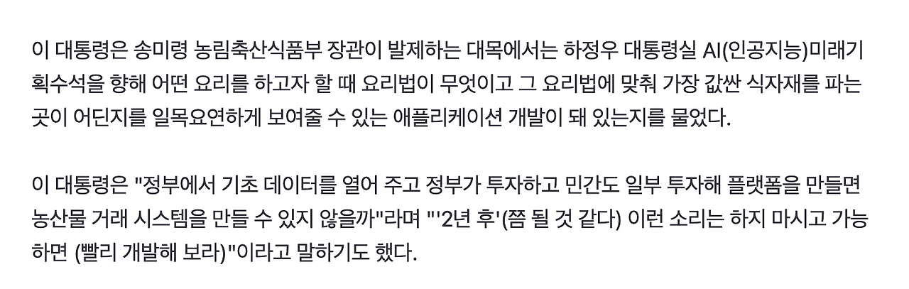 놀랍게도 대통령님이 '가장 값싼 식자재를 파는 곳이 어딘지를 일목요연하게 보여줄 수 있는 애플리케이션' 개발을 지시한 것이다. 심지어 '어떤 요리를 하고자 할 때 요리법이 무엇인지, 최저가로 구매가능한 곳은 어디인지' 역시 우리 디자인/개발 스펙에 이미 포함되어 있었다. 담당자분께 "저희는 2년이 아니라, 두 달이면 되는데요?"라고 말했고, 우리 팀은 서류를 합격할 수 있었다.
