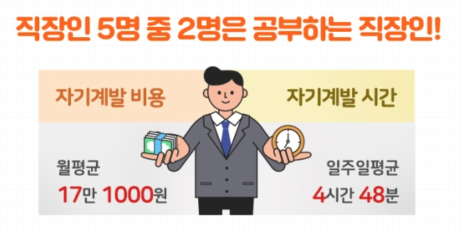 자기 계발 비용은 월평균 17만 1000원, 자기 계발 시간은 일주일 평균 4시간 48분이라고 한다.