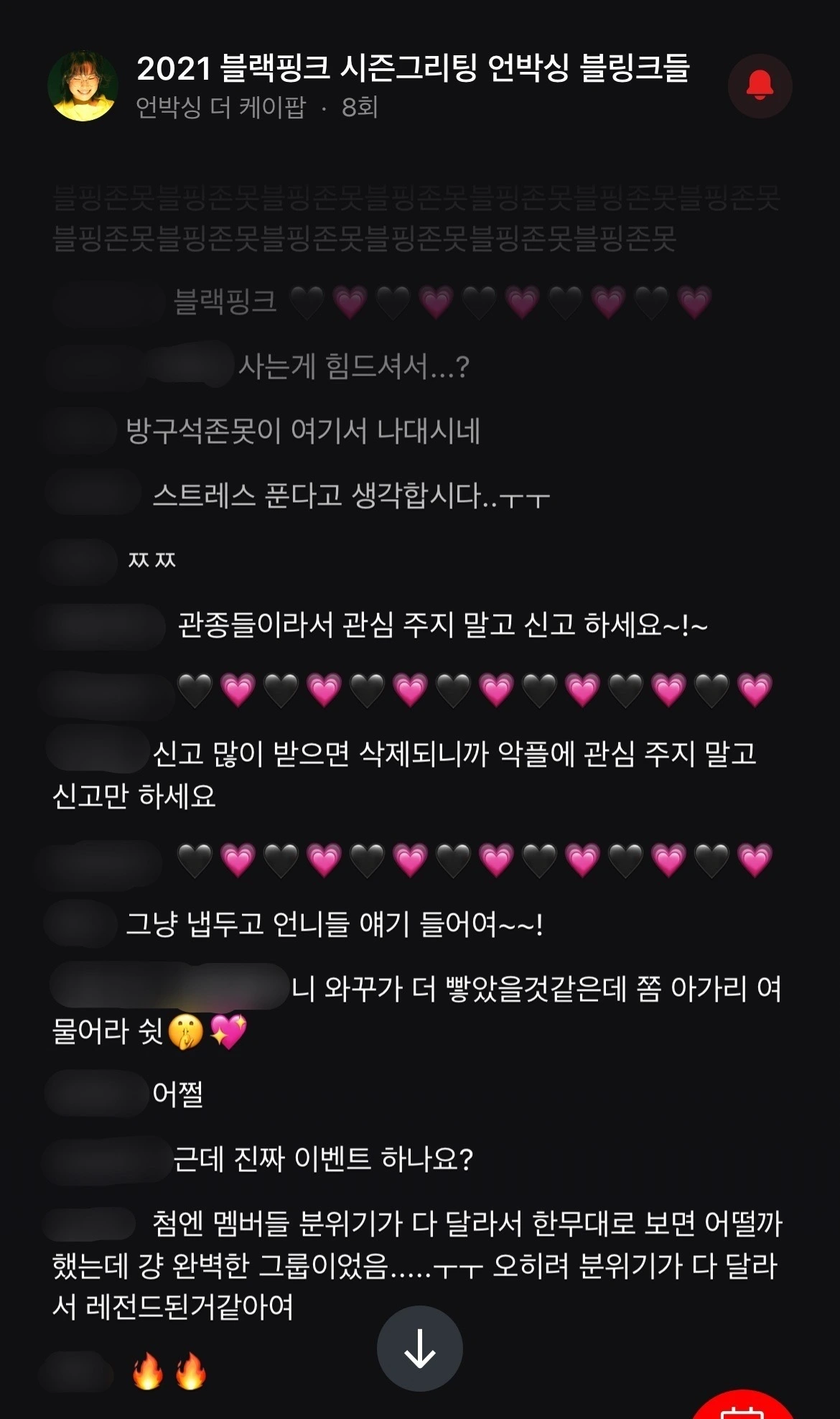 가장 당황스러웠던 순간은 8회 블랙핑크 편이었는데 정말 딱 한 명. 그 딱 한 명의 빌런(?)이 인신공격성 악플로 댓글창을 도배해 버린 것이다. 정말 스마트폰 세로 화면 창을 꽉 꽉 채워 성실히 도배했다. 다른 시청자분들이 합심해 신고해주어 1분도 안 되는 찰나에 사라졌지만 나는 쉽사리 다음 멘트를 이어갈 수 없었다.