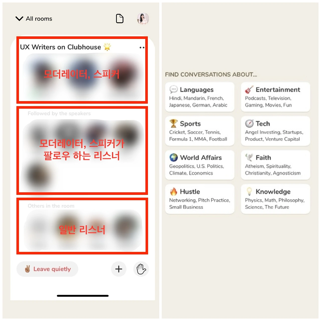 예를 들어 UX Writers 방에 질의응답을 받는데 질문한 사람은 금융 분야에 종사했다. 이때 다른 분야에 종사하는 모더레이터는 금융 분야에 종사하는 자신의 팔로잉에게 발언권을 주어 좀 더 풍성한 답변이 되도록 토론을 이끌었다. 리스너에 대한 구분이 없었다면 이는 쉽지 않았을 것이다. 클럽하우스는 밀러의 법칙대로 대화방의 멤버들을, 또 주제들을 잘 묶어 구분해 두고 있었다.