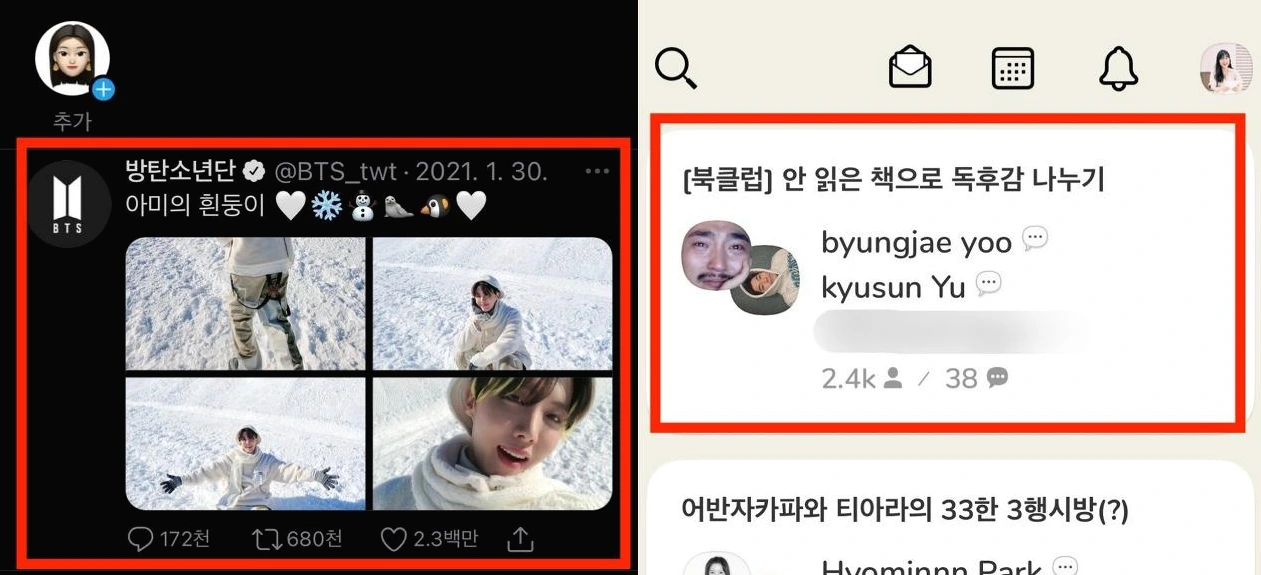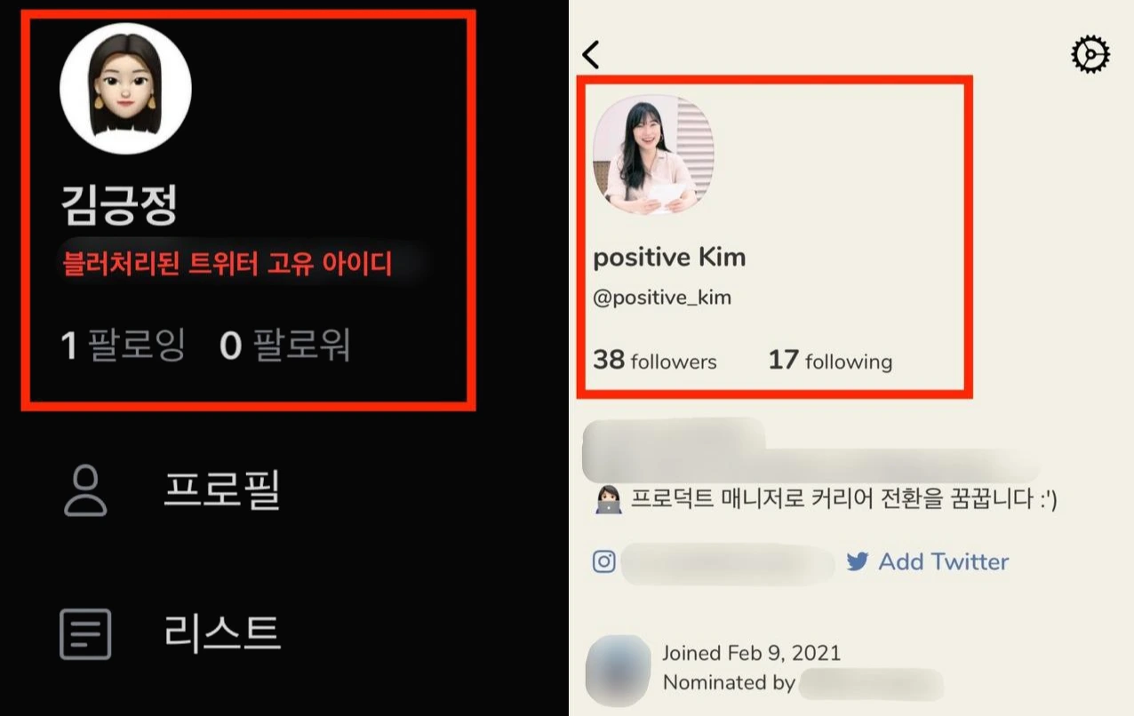 왼쪽 사진은 트위터와 클럽하우스의 첫 화면을 비교한 것인데 보통 페이스북, 인스타그램 등 다른 SNS는 프로필 아이콘 아래에 콘텐츠가 위치한다. 그런데 트위터는 프로필 아이콘 옆에 직사각형 박스 형태로 콘텐츠를 전달하고, 클럽하우스는 이를 한 박스로 묶어 담았다. 또 오른쪽 사진 프로필 화면의 경우 [사진 - 별명 - 아이디 - 팔로잉/팔로워]로 정보를 나타내는 플로우가 거의 같다. <제이콥의 법칙>대로 평소 익숙한 인터페이스로 인해 새로운 프로덕트에 적응하는 것에 별다른 어려움을 겪지 않았다.