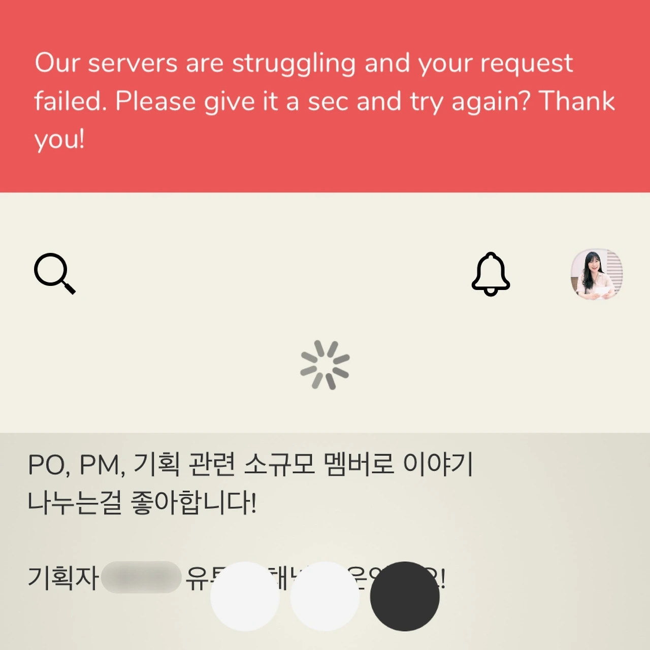 주로 새벽 3시에 클럽하우스 서버가 자주 다운되는데 그때마다 이런 문구나 로딩 중이라는 표현을 잘 띄워주었다. 이를 애니메이션이나 일단 기본 화면을 먼저 보여주는 스켈레톤 UI 등 조금 더 센스 있게 대처했으면 좋았을 텐데 클럽하우스는 그 부분이 아쉽게 느껴졌다. (왜냐하면 그만큼 서버가 자주 다운된다..)