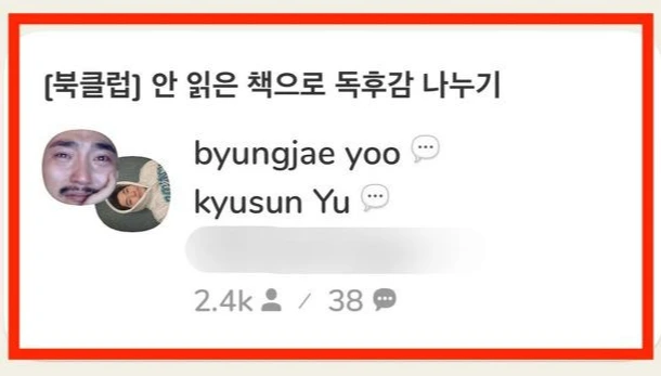 예를 들어 [안 읽은 책으로 독후감 나누기] 방의 경우 카피만으로도 충분한 분위기를 전달하지만, 이와 덧붙여 코미디언 유병재 님과 그의 매니저이자 인플루언서인 유규선 님이 입장해 있다는 정보를 제공해 보다 더 컨셉에 진심인 방임을 유추할 수 있다.