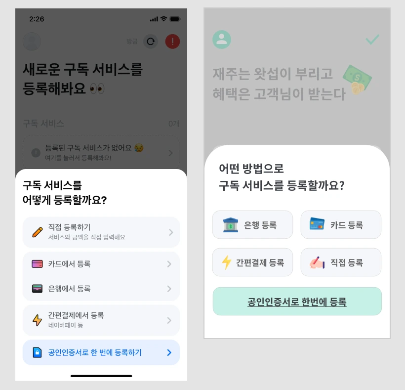 또 왓섭을 이용하는 이유가 간편하게 구독 결제를 관리하기 위함인데 [직접 등록하기]는 우선순위보다는 추가적인 기능이라고 생각해 맨 마지막으로 배치하는 등 순서를 조정했다.