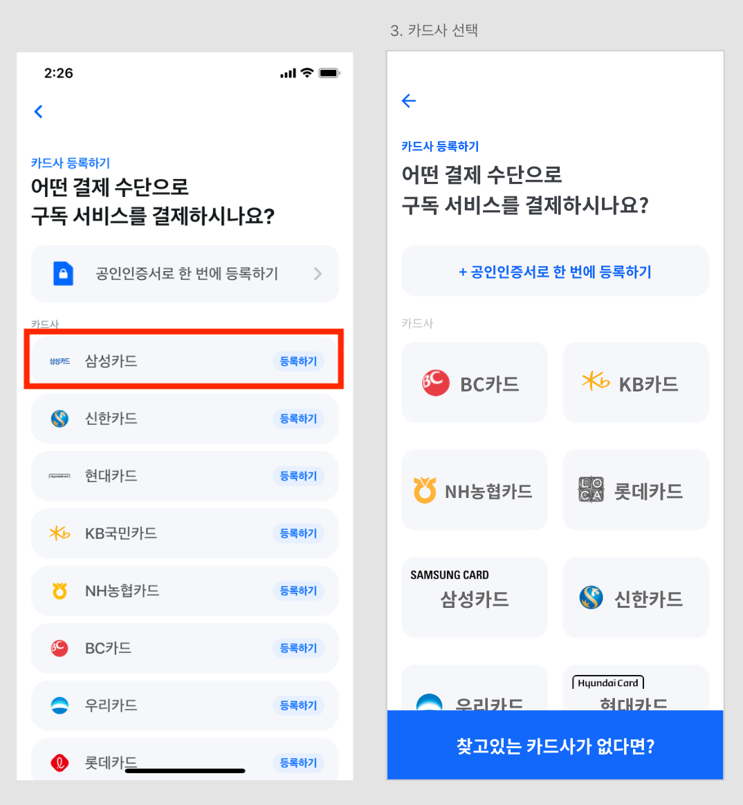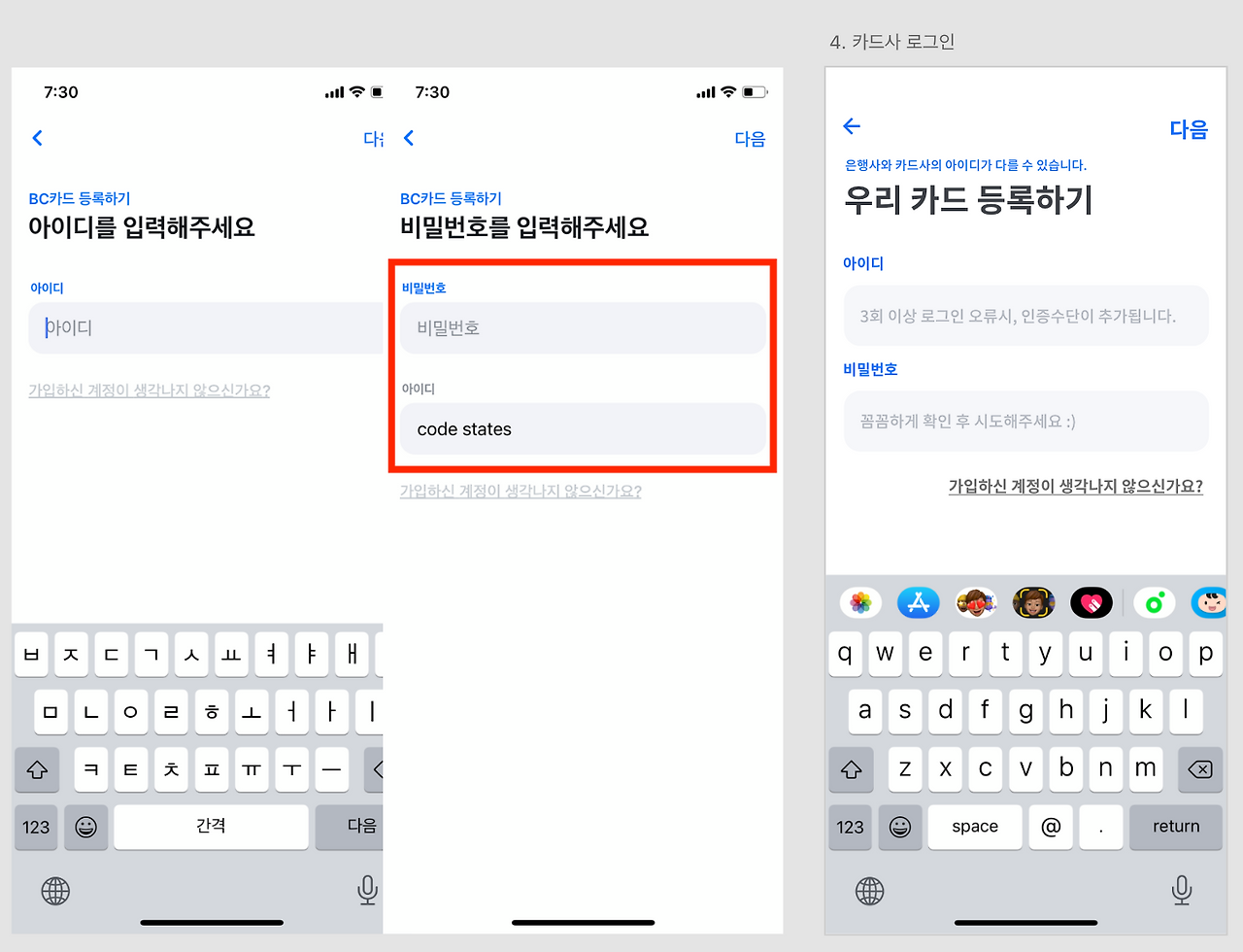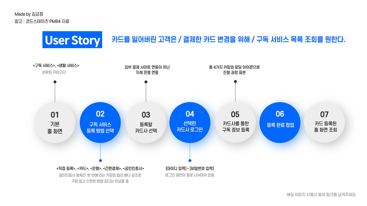왓섭 내 우리카드 등록을 위해 로그인을 시도했고 계속 실패했다. 우리은행 홈페이지로 들어가 여러 번의 로그인 실패로 인증 결제수단이 추가되고 나서야, 우리은행에만 회원가입이 되어 있고 우리카드에는 가입이 되어있지 않음을 깨달았다. 지금껏 은행의 자체 앱만 써 은행사와 카드사의 정보가 다를 수 있음을 몰랐던 것이다. 마침 다음 과제는 [유저 스토리 + Adobe XD를 활용한 UX/UI 개선]이라 로그인 과정에 이를 고지해주는 방향으로 기획했다.